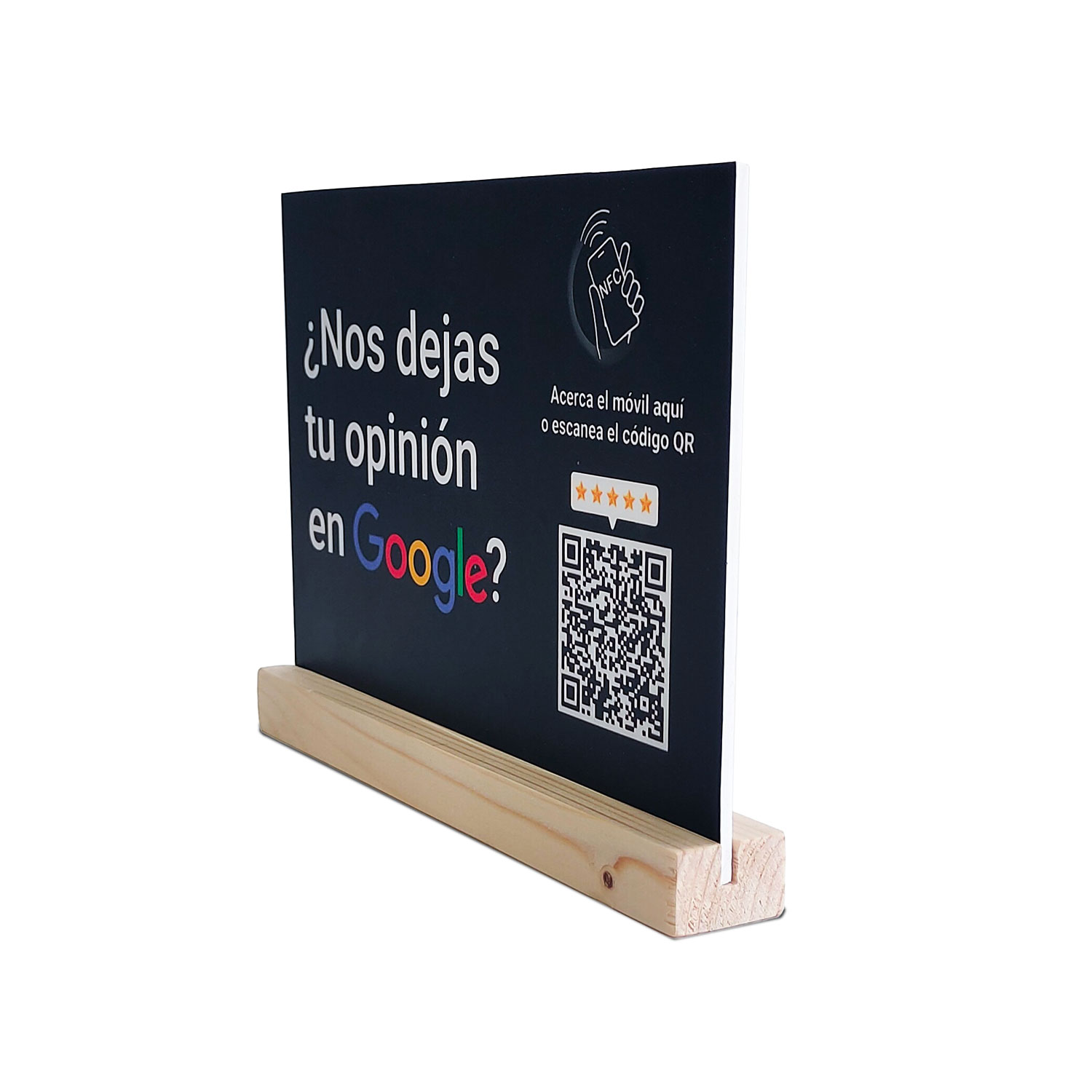 Este modelo combina código QR y tecnología NFC, para que tus clientes puedan elegir la forma más cómoda de dejar su opinión: escaneando el QR con la cámara de su móvil o acercando el teléfono al punto NFC. Incluye QR y NFC en un mismo cartel